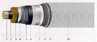 1.導體 2.導體屏蔽 3.油浸紙絕緣 4.絕緣屏蔽 5.鉛包 6.塑料護套 7.金屬帶鎧裝 8.光纖 9.鋼絲鎧裝 10.麻被