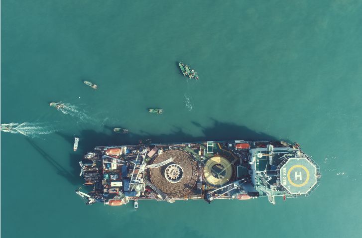 俯視海纜敷設(shè)施工船。(蔡勇 攝)