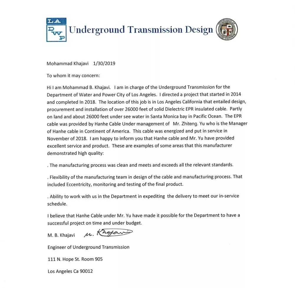 新春伊始,美國(guó)洛杉磯直流海纜項(xiàng)目順利完成交接試驗(yàn),并正式運(yùn)行。此線纜將服務(wù)于加利福尼亞地區(qū)千萬(wàn)人口。 基于我司在此項(xiàng)目中做出的突出貢獻(xiàn), 業(yè)主及施工方特此以書(shū)信的形式對(duì)漢纜進(jìn)行表彰與感謝。