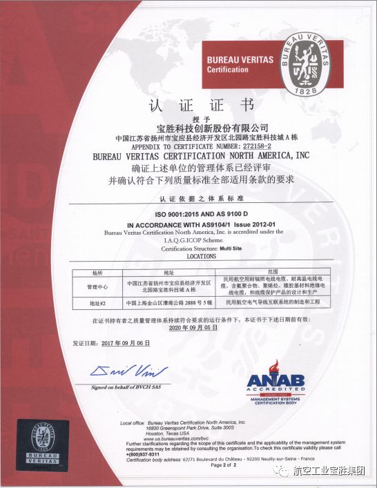 近日,寶勝特纜系統(tǒng)上海研發(fā)中心收到了來自必維國際檢驗集團發(fā)放的質(zhì)量管理體系認證證書,這也標志著寶勝特纜系統(tǒng)上海研發(fā)中心順利通過了線束制造AS9100的質(zhì)量體系轉版及擴證審核。