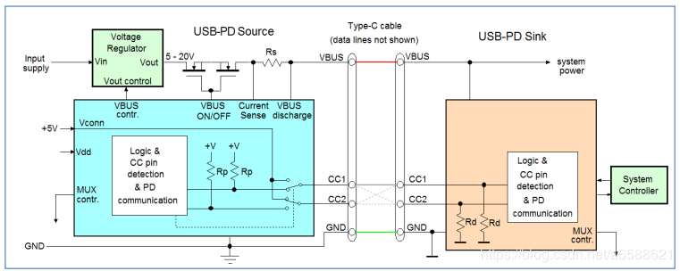 包含PD協(xié)議的Type-C 系統(tǒng)從Source到SINK的系統(tǒng)框圖大致如下: