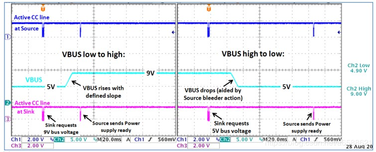 (5)在電壓變化期間,SINK的電流會保持盡可能小,Source端VBUS到達9V并穩(wěn)定之后,會發(fā)出Ready信號