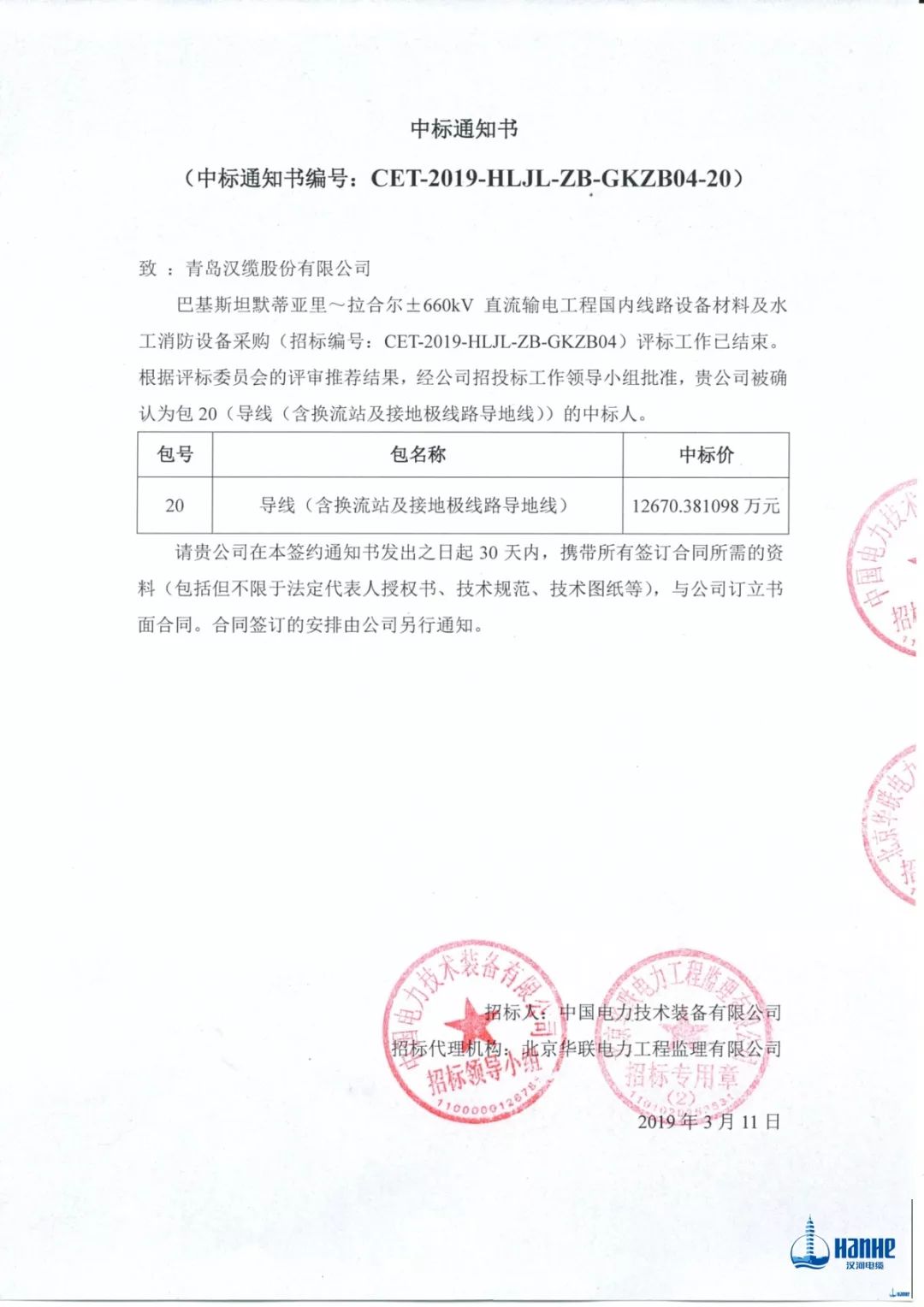 草木蔓發(fā),春山可望,在這孕育著生機(jī)的春日,青島漢纜股份有限公司喜訊連連,繼勇獲海上風(fēng)電3億訂單之后,又收到中國電力技術(shù)裝備有限公司《巴基斯坦默蒂亞里~拉合爾±660kV直流輸電工程》中標(biāo)通知書,公司成功中標(biāo)JL1/G3A-1250/70鋼芯鋁絞線約7900噸,中標(biāo)金額約1.267億元,本項(xiàng)目是落實(shí)國家“一帶一路”戰(zhàn)略,推動中巴經(jīng)濟(jì)走廊建設(shè)的重要舉措。為中國與巴基斯坦良好雙邊經(jīng)貿(mào)關(guān)系添了濃重墨彩的一筆。 巴基斯坦默蒂亞里~拉合爾±660kV直流輸電工程是國家電網(wǎng)公司援建的巴基斯坦首個(gè)660千伏高壓直流輸電項(xiàng)目,是在中巴經(jīng)濟(jì)走廊的背景下產(chǎn)生的,以連接默蒂亞里縣、信德省和拉哈爾市,全長大約878千米,輸電能力達(dá)到4000兆瓦。 2015年4月20日,在中巴兩國領(lǐng)導(dǎo)人的見證下,國家電網(wǎng)公司與巴基斯坦國家輸電公司簽署默蒂亞里-拉合爾特高壓直流輸變電項(xiàng)目合作協(xié)議。這是繼巴西之后,國家電網(wǎng)公司承攬的第二個(gè)特高壓輸電國際工程。 2016年12月29日,在中巴經(jīng)濟(jì)走廊委員會第六次會議上簽署項(xiàng)目相關(guān)執(zhí)行協(xié)議,中電裝備公司將以BOOT(建設(shè)-擁有-經(jīng)營-轉(zhuǎn)讓)方式開發(fā)此項(xiàng)目。本項(xiàng)目是落實(shí)國家“一帶一路”戰(zhàn)略,推動中巴經(jīng)濟(jì)走廊建設(shè)的重要舉措。 該訂單是中國第一次出口1250/70大截面鋼芯鋁絞線產(chǎn)品,數(shù)量較大,競爭異常激烈。在公司領(lǐng)導(dǎo)的幫助和支持下,一帶一路項(xiàng)目部從2016年8月起開始跟蹤配合,歷時(shí)兩年零八個(gè)月,始終關(guān)注項(xiàng)目的進(jìn)展情況,三次主動到EPC公司和設(shè)計(jì)院進(jìn)行商務(wù)技術(shù)交流,讓客戶和設(shè)計(jì)人員更加了解漢纜的產(chǎn)品和實(shí)力,最終漢纜憑借雄厚的技術(shù)、質(zhì)量、交貨、成本和服務(wù)實(shí)力斬獲此訂單。 THE END 此項(xiàng)目訂單簽訂,為國家電網(wǎng)公司特高壓輸電項(xiàng)目出口做出了貢獻(xiàn),是青島漢纜響應(yīng)國家“一帶一路”倡議,積極拓展海外業(yè)務(wù)、助力“中巴經(jīng)濟(jì)走廊”建設(shè)的重要成果,為公司下一步實(shí)施國際化發(fā)展戰(zhàn)略打下了堅(jiān)實(shí)的基礎(chǔ)。