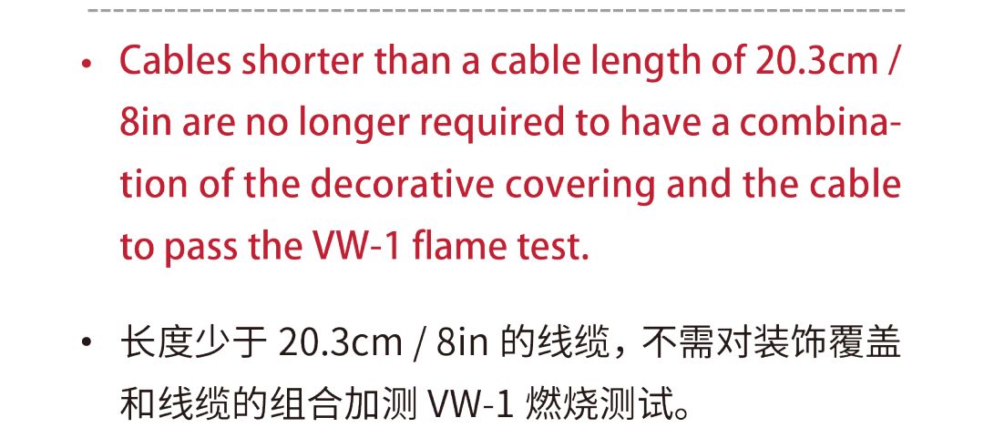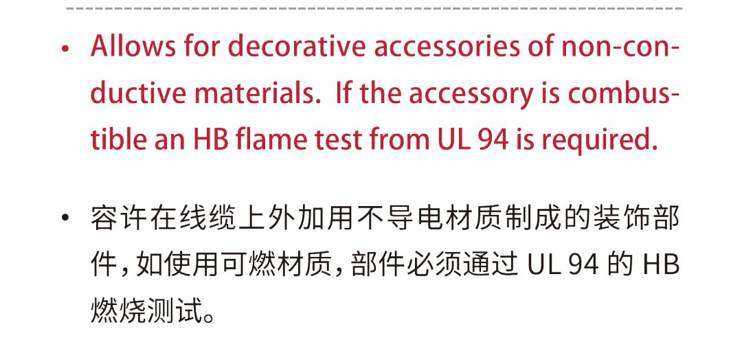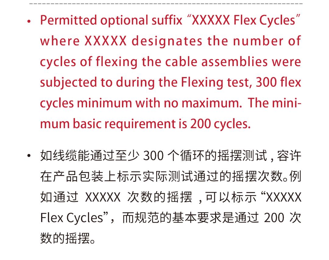更新后的測(cè)試內(nèi)容中英文對(duì)照如下: Sec. 5.2 Sec. 5.2 Sec. 5.7 Sec. 5.8 Sec. 13.1e 以上概要及其中文翻譯謹(jǐn)供參考 詳情和要求請(qǐng)參閱UL 9990 規(guī)范 UL 9990 信息和通信技術(shù) (ICT) 數(shù)據(jù)充電線安全認(rèn)證計(jì)劃,旨在助力高速數(shù)據(jù)電纜制造商盡早彌合前沿技術(shù)發(fā)展與標(biāo)準(zhǔn)及測(cè)試服務(wù)開發(fā)之間的缺位,凸顯產(chǎn)品差異化優(yōu)勢(shì),有效擴(kuò)大市場(chǎng)份額。 現(xiàn)今,高速數(shù)據(jù)電纜已經(jīng)取代傳統(tǒng)電源線,被廣泛應(yīng)用于為筆記本電腦、平板電腦、手機(jī)、移動(dòng)電源等IT和通訊設(shè)備進(jìn)行供電和充電。 為了滿足高速充電以及高功率設(shè)備供電的需要,ICT數(shù)據(jù)充電線的功率容量正在不斷增加。然而在實(shí)際應(yīng)用過(guò)程中,用戶可能并不知道由于使用了不良結(jié)構(gòu)的電纜,ICT數(shù)據(jù)充電線的使用常常伴隨著潛在的過(guò)熱和火災(zāi)風(fēng)險(xiǎn),比如一些電纜由于使用了不合規(guī)的材質(zhì)而導(dǎo)致耐燃性和耐熱性較差;接頭設(shè)計(jì)不符合規(guī)范;布線時(shí)電纜和接頭沒(méi)有規(guī)范銜接;或是電纜的裝配無(wú)法承載要求的電流。 本次更新后的“UL 9990”信息和通信技術(shù)(ICT)數(shù)據(jù)充電線安全認(rèn)證計(jì)劃,測(cè)試方法上對(duì)ICT數(shù)據(jù)線的做了進(jìn)一步的嚴(yán)格把關(guān),力圖解決使用中出現(xiàn)的安全隱患,增強(qiáng)了零售商、安裝商和品牌所有的信心,提升市場(chǎng)競(jìng)爭(zhēng)力。 UL 9990“信息和通信技術(shù)(ICT)數(shù)據(jù)充電線安全認(rèn)證計(jì)劃”為制造商提供產(chǎn)品測(cè)試服務(wù),該計(jì)劃針對(duì)電路中設(shè)備供電和充電的電纜組件,其電氣參數(shù)為直流60V、8.0A和100W以下的部分,力圖解決ICT數(shù)據(jù)充電線的安全隱患(UL根據(jù)UL 9990將其命名為信息和通信技術(shù)(ICT)數(shù)據(jù)充電線安全認(rèn)證計(jì)劃)。 隨著高速數(shù)據(jù)電纜廣泛的用于ICT產(chǎn)品(筆記本,平板PAD,手機(jī)等)進(jìn)行供電和充電,數(shù)據(jù)充電線的功率就會(huì)不斷增加;而伴隨著功率的增加,產(chǎn)品就會(huì)并存潛在的過(guò)熱和過(guò)載及火災(zāi)風(fēng)險(xiǎn)。有鑒于此,美國(guó)UL認(rèn)證公司于2017年05月23日在全球率先制訂出了有關(guān)于管控充電線的安全標(biāo)準(zhǔn)UL9990. UL9990標(biāo)準(zhǔn),從結(jié)構(gòu)、機(jī)械性能、充電溫升、耐電壓、故障電流、燃燒等方面對(duì)充電線進(jìn)行了規(guī)定,以保障消費(fèi)者在使用過(guò)程中的安全性。 帶充電功能的數(shù)據(jù)線均需要通過(guò)UL9990認(rèn)證 UL9990主要產(chǎn)品類別: Type-C數(shù)據(jù)線 Lightning Cable Micro B數(shù)據(jù)線等 主要測(cè)試項(xiàng)目: (1)Strain-Relief Test(掉網(wǎng)尾測(cè)試) (2)Flexing Tset(搖擺測(cè)試) (3)Normal Temperature Test(溫升測(cè)試) (4)12mm end-product flame test(12mm火焰測(cè)試) (5)Dielectric Voltage-Withstand Test(耐電壓測(cè)試) (6)Fault Current Test(故障電流測(cè)試) (7)VW-1燃燒測(cè)試 UL9990出貨標(biāo)簽圖: 注意,通過(guò)UL9990認(rèn)證前提是零部件材料需要符合UL要求,以及線纜必須通過(guò)VW-1燃燒測(cè)試,USB Type-C連接器以及整條數(shù)據(jù)線首先要通過(guò)USB-IF協(xié)會(huì)的認(rèn)證并取得相應(yīng)的TID號(hào)。