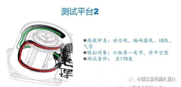而實際上的機器人狀況是多種不同線纜加氣管、多種不運動的組合,所以我們當時的做法是,根據(jù)企業(yè)自身的產(chǎn)品把對機器人分成不同的關(guān)節(jié)運動,然后把機構(gòu)簡化變成線纜測試平臺。這是在初期投入很少的測試,而當產(chǎn)品豐富之后,最直接的當然是直接上機器人測試,或者使用機器人進行改造變成測試平臺,因為標準機器人因為外面有防護殼等,要停機檢測不太方便。