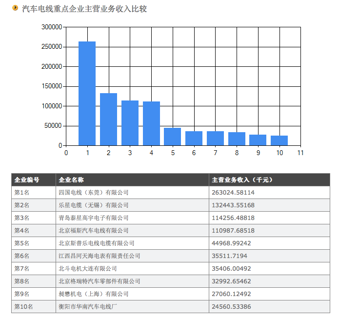 汽車電線重點(diǎn)企業(yè)主營業(yè)務(wù)收入比較 - 無圖版