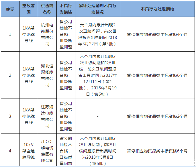 1 1kV架空絕緣導(dǎo)線杭州電纜股份有限公司省公司抽檢不合格,Ⅲ級質(zhì)量問題六個月內(nèi)累計出現(xiàn)2次Ⅲ級問題,前次Ⅲ級報告出具時間2018年3月22日(第3批)暫停相應(yīng)物資品類中標(biāo)資格4個月