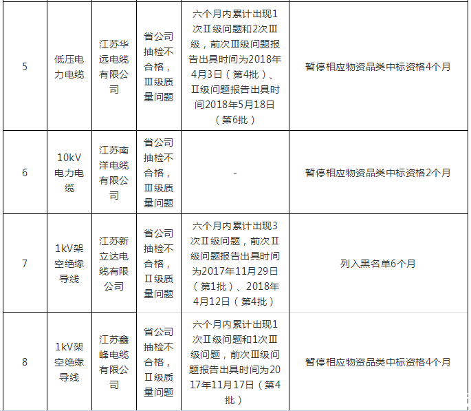 5低壓電力電纜江蘇華遠(yuǎn)電纜有限公司省公司抽檢不合格,Ⅲ級質(zhì)量問題六個月內(nèi)累計出現(xiàn)1次Ⅱ級問題和2次Ⅲ級,前次Ⅲ級問題報告出具時間為2018年4月3日(第4批)、Ⅱ級問題報告出具時間2018年5月18日(第6批)暫停相應(yīng)物資品類中標(biāo)資格4個月
