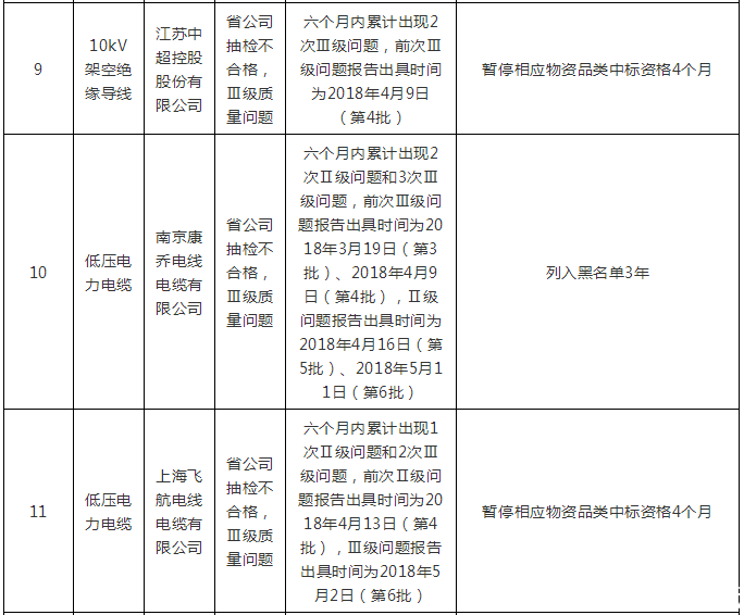 10低壓電力電纜南京康喬電線電纜有限公司省公司抽檢不合格,Ⅲ級質(zhì)量問題六個月內(nèi)累計出現(xiàn)2次Ⅱ級問題和3次Ⅲ級問題,前次Ⅲ級問題報告出具時間為2018年3月19日(第3批)、2018年4月9日(第4批),Ⅱ級問題報告出具時間為2018年4月16日(第5批)、2018年5月11日(第6批)列入黑名單3年