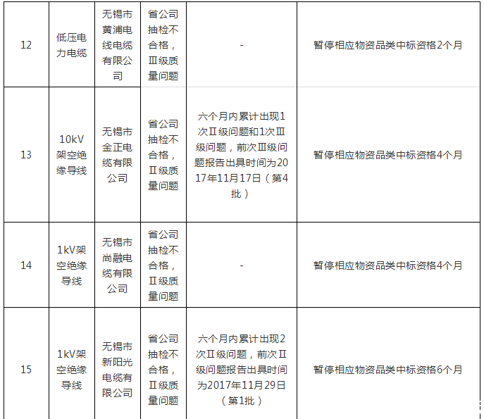 13 10kV架空絕緣導(dǎo)線無錫市金正電纜有限公司省公司抽檢不合格,Ⅱ級質(zhì)量問題六個月內(nèi)累計出現(xiàn)1次Ⅱ級問題和1次Ⅲ級問題,前次Ⅲ級問題報告出具時間為2017年11月17日(第4批)暫停相應(yīng)物資品類中標(biāo)資格4個月