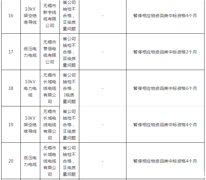 20 低壓電力電纜無錫市長城電線電纜有限公司省公司抽檢不合格,Ⅱ級質(zhì)量問題-暫停相應(yīng)物資品類中標(biāo)資格4個月