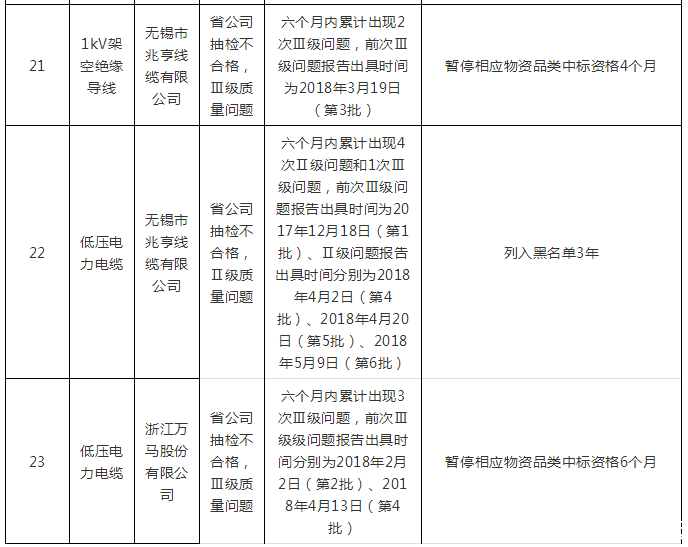 23低壓電力電纜浙江萬馬股份有限公司省公司抽檢不合格,Ⅲ級質(zhì)量問題六個月內(nèi)累計出現(xiàn)3次Ⅲ級問題,前次Ⅲ級級問題報告出具時間分別為2018年2月2日(第2批)、2018年4月13日(第4批)暫停相應(yīng)物資品類中標(biāo)資格6個月
