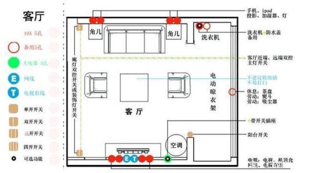 ②沙發(fā)兩側每一邊各安裝2個五孔插座,以防家庭成員集中在客廳,有的人在玩手機的時候沒有充電的地方,避免用插線板拖的到處都是。