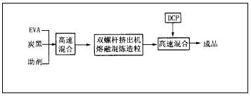 將EVA、炭黑、助劑等在高速混合機中混合后,加人到雙螺桿擠出機中,在150-210℃熔融混煉,從口模擠出造粒,將上述粒料加人到高速混合機中高速攪拌并加入交聯(lián)劑DCP,在60℃時出料。