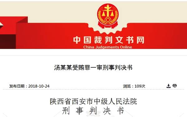 8月8日,西安中院一審判決湯某某犯受賄罪,判處有期徒刑六個(gè)月,緩刑一年,并處罰金十萬(wàn)元。