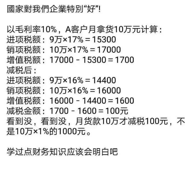 朋友們,還記得去年國(guó)家把增值稅從17%降到16%,眾多朋友反應(yīng)它們的客戶(hù)借機(jī)要求降價(jià)1%,從感覺(jué)上來(lái)說(shuō),似乎給客戶(hù)下降1%是合理的,但從直覺(jué)上又覺(jué)得簡(jiǎn)單降價(jià)1%不太對(duì)。感覺(jué)不對(duì),有點(diǎn)亂,得捋一捋。