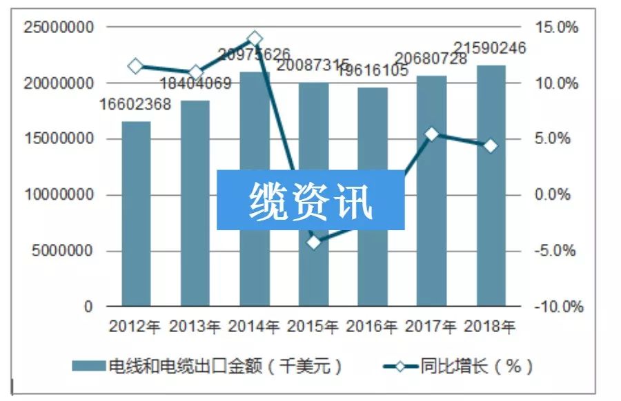 據(jù)中國(guó)海關(guān)數(shù)據(jù)顯示:2018年1-12月中國(guó)電線和電纜出口數(shù)量為242萬(wàn)噸,同比增長(zhǎng)0.4%,增速較上一年下降7.4%;2018年1-12月中國(guó)電線和電纜出口金額為21590246千美元,同比增長(zhǎng)4.4%,增速較上一年微降1個(gè)點(diǎn)。