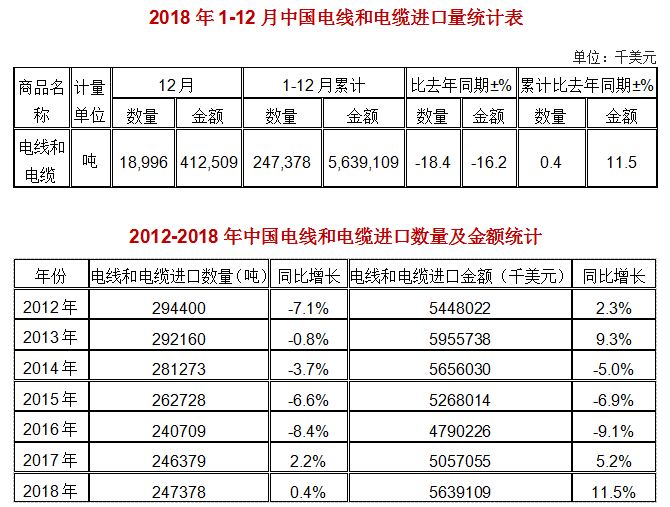 據(jù)中國(guó)海關(guān)數(shù)據(jù)顯示:2018年1-12月中國(guó)電線和電纜進(jìn)口數(shù)量為247378噸,同比增長(zhǎng)0.4%;2018年1-12月中國(guó)電線和電纜進(jìn)口金額為5639109千美元,同比增長(zhǎng)11.5%。