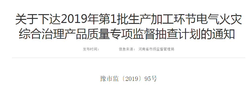 4月2日,河南省市場監(jiān)督管理局發(fā)布通知稱,為深入貫徹落實《國務(wù)院安全生產(chǎn)委員會關(guān)于開展電氣火災(zāi)綜合治理工作的通知》(安委〔2017〕4號)和省政府安委會《關(guān)于印發(fā)全省電氣火災(zāi)綜合治理工作實施方案的通知》(豫安委〔2017〕7號)工作部署,進一步加強全省電氣火災(zāi)防范和生產(chǎn)加工環(huán)節(jié)電氣產(chǎn)品質(zhì)量安全監(jiān)管,河南省市場監(jiān)督管理局(以下簡稱省局)決定在全省開展2019年第1批生產(chǎn)加工環(huán)節(jié)電氣火災(zāi)綜合治理產(chǎn)品質(zhì)量專項監(jiān)督抽查,F(xiàn)就有關(guān)工作通知如下: