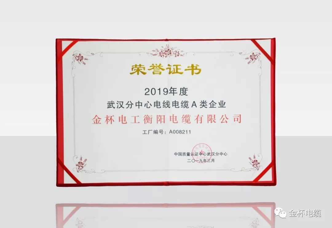 2019年4月9日上午,中國質(zhì)量認(rèn)證中心武漢分中心曾軍武部長蒞臨金杯,為金杯電纜連續(xù)5年榮獲電線電纜A類企業(yè)進(jìn)行現(xiàn)場授牌。公司總經(jīng)理謝良瓊、總工程師艾衛(wèi)民代表公司接受由武漢分公司中心頒發(fā)的牌匾和證書。
