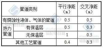 (1) 與熱水管、蒸汽管同側(cè)敷設(shè)時(shí),應(yīng)敷設(shè)在熱水管、蒸汽管的下方;當(dāng)有困難時(shí), 可敷設(shè)在其上方;其相互間的凈距不宜小于下列數(shù)值: