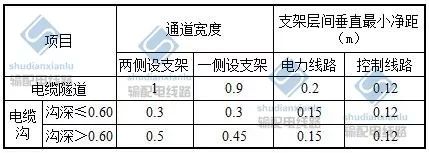 1 、電纜在電纜溝和電纜隧道內(nèi)敷設(shè)時(shí),其通道寬度和支架層間垂直距離的最小凈距應(yīng)符合下表的規(guī)定。