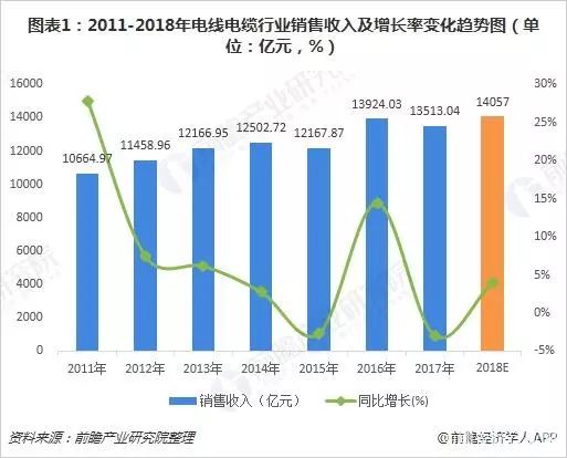 隨著我國(guó)電線電纜行業(yè)的調(diào)整進(jìn)入深化發(fā)展期,其過(guò)剩、劣質(zhì)產(chǎn)能的淘汰雖然會(huì)對(duì)行業(yè)的整體市場(chǎng)規(guī)模有一定的影響,但是產(chǎn)品逐漸由電力電纜向特種電纜轉(zhuǎn)變,在國(guó)內(nèi)相關(guān)產(chǎn)業(yè)發(fā)展及對(duì)外一帶一路發(fā)展戰(zhàn)略的促進(jìn)下,2018年我國(guó)電線電纜行業(yè)的銷售收入實(shí)現(xiàn)繼續(xù)小幅增加,超過(guò)14000億元。