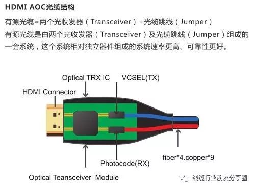 從HDMI 1.0到HDMI 2.1,信號的分辨率、幀率等都在提高,也就意味著信號的數(shù)據(jù)總量也跟著增加,4K信號的數(shù)據(jù)總量是1080p的4倍,如果你把線材想成管道,也就意味著你需要更大的管道來傳輸數(shù)據(jù),我們傳統(tǒng)使用的HDMI銅線的傳導性,基本是由銅線的數(shù)量決定的,銅線越多,傳導性越好,也就是說如果傳輸信號總量和速度增加的話,銅線的大小和重量也必然跟著增加,用過HDMI銅線的朋友應該都知道那重量不輕,從日常使用的角度來看,確實不太方便.偷偷告訴你,光纖HDMI的秘密.Active Optical Cable (AOC),號稱下一代線纜/連接器的AOC,較銅線輕薄,因為其光纖的特性可以克服銅線的長度限制,AOC并不會因為線纜長度的增加而影響其性能表現(xiàn)(performance),例如:200米的HDMI光纖線纜跟1米的HDMI光纖線纜,其性能表現(xiàn)依舊是一樣的,光纖所費比銅線高昂,但是并不是貴在線纜的本身,而是兩端的光電組件和IC.