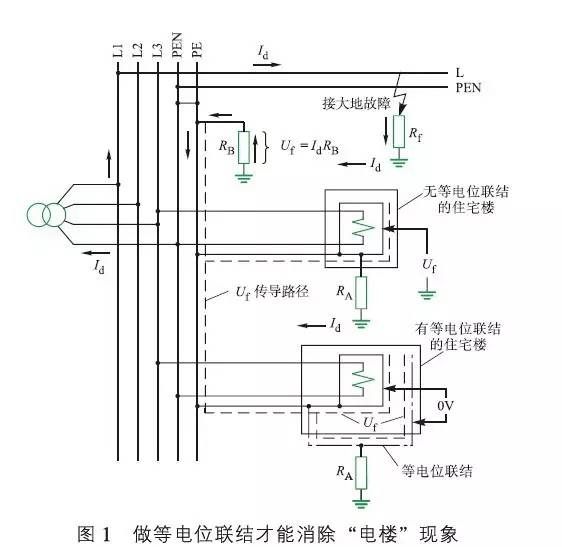 從圖1可知,無等電位聯(lián)結(jié)作用的住宅樓成為“電樓”,而有等電位聯(lián)結(jié)作用(圖中虛線所示,它包括自然接觸形成的自然等電位聯(lián)結(jié)作用)的住宅樓則不會成為“電樓”。需知消除轉(zhuǎn)移故障電壓危害是等電位聯(lián)結(jié)的諸多重要作用之一。