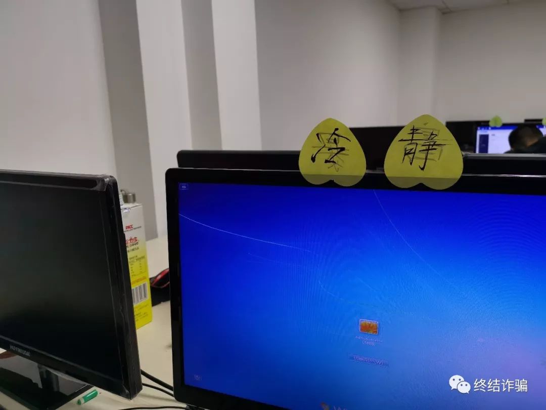 騙子的電腦上貼滿了暴富、冷靜的提醒字帖