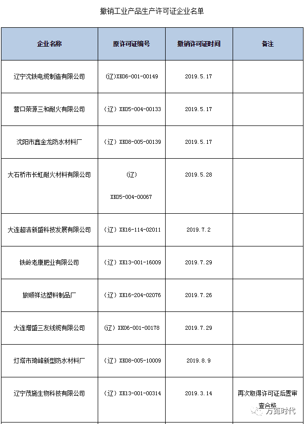 8月15日,遼寧省市場(chǎng)監(jiān)督管理局網(wǎng)站發(fā)布關(guān)于對(duì)19家獲證企業(yè)撤銷工業(yè)產(chǎn)品生產(chǎn)許可證的通告。