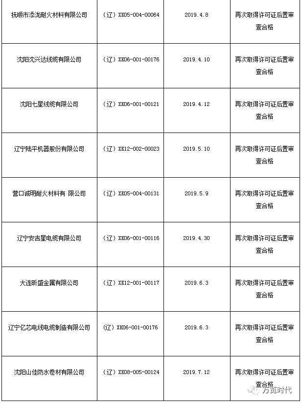 2019年2月-7月,根據(jù)《市場(chǎng)監(jiān)管總局關(guān)于公布工業(yè)產(chǎn)品生產(chǎn)許可證實(shí)施通則及實(shí)施細(xì)則的公告》〔2018年第26號(hào)〕,遼寧省市場(chǎng)監(jiān)督管理局對(duì)省級(jí)工業(yè)產(chǎn)品生產(chǎn)許可證獲證企業(yè)開(kāi)展后置現(xiàn)場(chǎng)審查,19家獲證企業(yè)不符合《工業(yè)產(chǎn)品生產(chǎn)許可證實(shí)施細(xì)則通則》和《工業(yè)產(chǎn)品生產(chǎn)許可證實(shí)施細(xì)則》的有關(guān)要求,后置現(xiàn)場(chǎng)審查不合格。