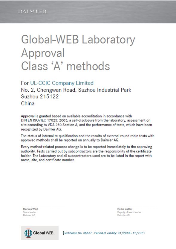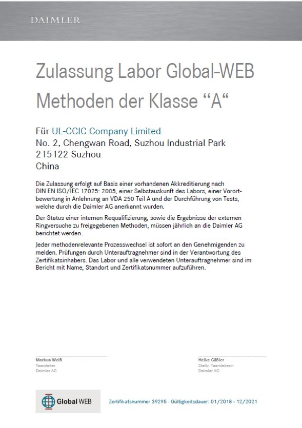 近日,蘇州UL美華認(rèn)證有限公司獲得德國(guó)戴姆勒集團(tuán)“A類實(shí)驗(yàn)室” 認(rèn)證。此認(rèn)證是戴姆勒集團(tuán)根據(jù)《DIN EN ISO/IEC 17025》、《VDA 250》 A章節(jié)對(duì)UL蘇州實(shí)驗(yàn)室進(jìn)行的現(xiàn)場(chǎng)評(píng)估并給出滿意的結(jié)論后授予的。