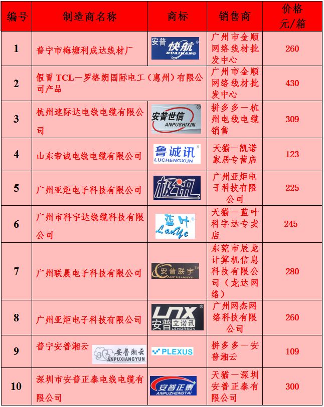 30個(gè)購買樣品,價(jià)格從109-530元不等,經(jīng)專家提供超五類網(wǎng)線BOM表,材料成本270元,綜合考慮市場(chǎng)銷售上浮至310元,310元以下為低價(jià)產(chǎn)品,除1款特價(jià)處理產(chǎn)品,其他正常銷售的低價(jià)產(chǎn)品均不達(dá)標(biāo),建議經(jīng)銷商不要銷售,消費(fèi)者不要購買低于310元的產(chǎn)品。