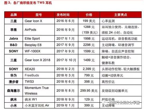 據(jù) IDC 預(yù)測,耳機(jī)將會是增長最快的可穿戴設(shè)備,2018 年到 2022 年復(fù)合增長率達(dá) 56%, Futuresource 的報告中指出,2019 年可穿戴設(shè)備市場全球出貨量有望突破 2.229 億臺,若按照 7.9%的復(fù)合年增長率來計算,2023 年市場規(guī)模將增加至 3.023 億臺,增長的主要驅(qū)動力就是智能手表和耳塞式設(shè)備,在 2023 年的市場占比份額將超過 70%,中國市場 2019 年第一季度可穿戴設(shè)備市場出貨量為 1950 萬臺,同比增長 34.7%,其中基礎(chǔ)可穿戴設(shè)備(不支持第三方應(yīng)用的可穿戴設(shè)備)同比增長 25.5%,智能可穿戴設(shè)備同比增長達(dá)到 84.6%,我們認(rèn)為,藍(lán)牙技術(shù)、芯片方案等核心技術(shù)升 級,手機(jī)結(jié)構(gòu)變化和系統(tǒng)支持,伴隨 AI 和傳感器技術(shù)的成熟,有望推動 TWS 耳機(jī)實現(xiàn)快速持續(xù) 發(fā)展,預(yù)計未來三年 TWS 耳機(jī)銷量將有望實現(xiàn)翻倍以上增長,將成為耳機(jī)市場的主流.