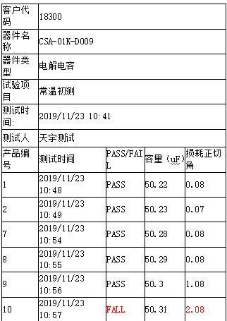 測(cè)試結(jié)束后,軟件可以生成測(cè)試報(bào)告,報(bào)告的輸出形式多樣化用戶可以自定義。報(bào)告中以產(chǎn)品型號(hào),產(chǎn)品編號(hào),測(cè)試時(shí)間和測(cè)試人員作為表頭,之后是本次測(cè)試的全部測(cè)試數(shù)據(jù),其中測(cè)試不合格項(xiàng)會(huì)進(jìn)行紅色提醒。