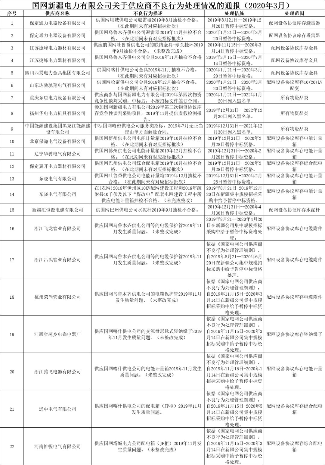 十三、國網(wǎng)新疆電力有限公司關于供應商不良行為處理情況的通報(2020年3月)