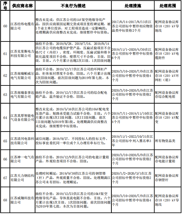 九、國網(wǎng)江蘇省電力有限公司關于供應商不良行為處理情況的通報(2020年3月)