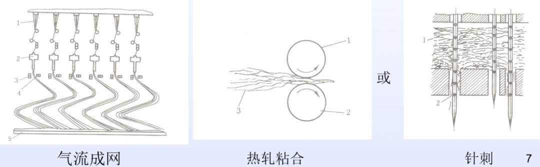 ②紡粘法:纖網(wǎng)加固方式多,除熱粘合外,還可采取針刺、水刺、化學(xué)粘合等多種手段
