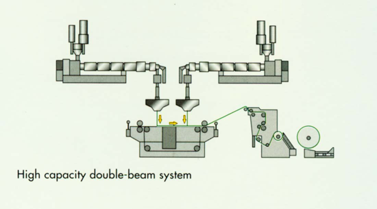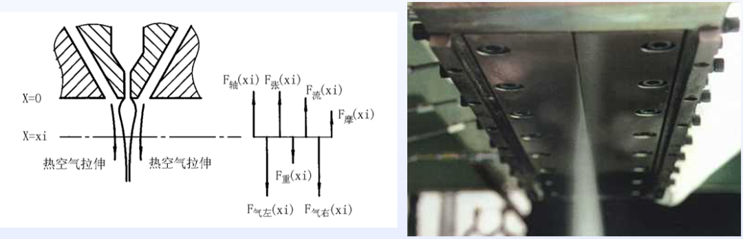 纖維形成 —— 經(jīng)過(guò)濾的清潔熔體要經(jīng)過(guò)分配系統(tǒng),再均勻送入每組噴絲板,使每個(gè)噴絲孔的擠出量一致。熔噴纖維的噴絲板與其它紡絲成網(wǎng)法不同,噴絲孔必須排成一直線(xiàn),上下兩側(cè)開(kāi)有高速氣流的噴出孔。