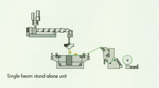 熔噴法也是聚合物直接成網(wǎng)法中的一種,它是將螺桿擠出機(jī)擠出的高聚物熔體通過(guò)用高速高溫氣流噴吹或其它手段使熔體細(xì)流受到極度的拉伸而形成極細(xì)的纖維,然后聚集到成網(wǎng)滾筒或成網(wǎng)簾上形成纖網(wǎng),最后經(jīng)自粘合作用得以加固而制成熔噴法纖維非織造布。