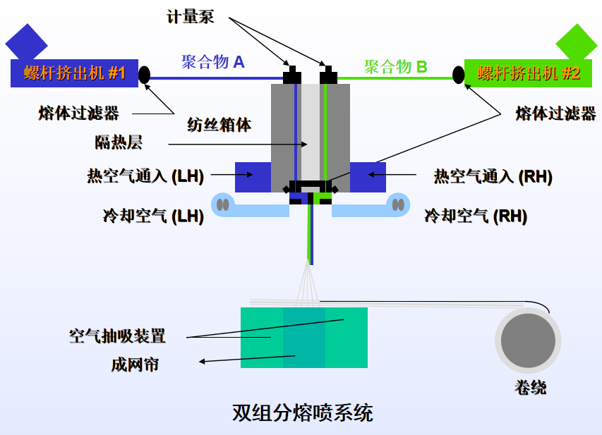 纖維冷卻——在噴絲板的兩側(cè)有大量的室溫空氣同時(shí)被吸入,與含有超細(xì)纖維的熱空氣流相混,使其降溫,熔融的超細(xì)纖維冷卻固化。