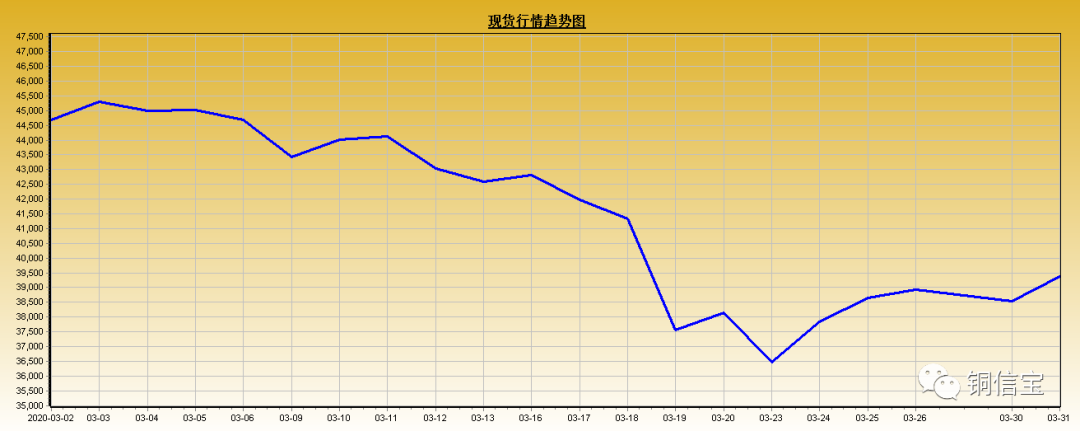3月銅價重心較2月大幅下滑,跳空低開頻繁,整體波動區(qū)間在35300-45990元/噸。
