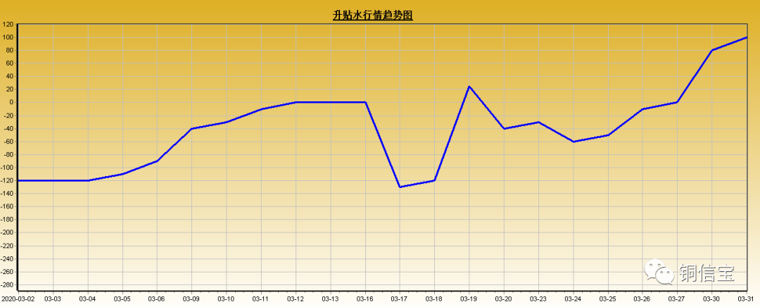 3月銅現(xiàn)貨價格、升貼水價格走勢圖如下。