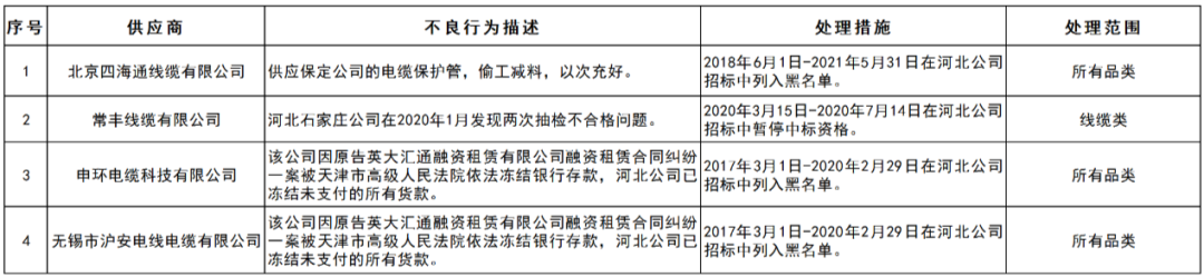 2020年4月份,國家電網(wǎng)電子商務(wù)平臺公布了供應(yīng)商不良行為處理名單,依據(jù)《國家電網(wǎng)公司供應(yīng)商不良行為處理管理細(xì)則》的有關(guān)規(guī)定,對出現(xiàn)產(chǎn)品質(zhì)量問題、履約不誠信等問題的供應(yīng)商進(jìn)行了處理。處理措施主要包括:暫停中標(biāo)資格、列入黑名單等。