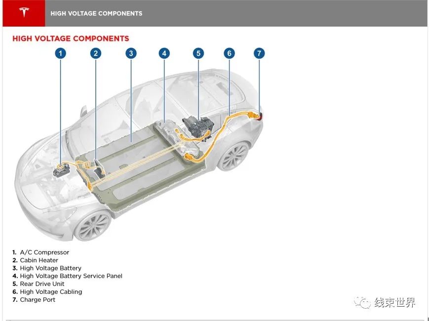 上圖No.1是Model3的高壓系統(tǒng)簡(jiǎn)圖,這是一個(gè)非常精煉的高壓系統(tǒng),平鋪在底盤上的動(dòng)力電池③,動(dòng)力電池后上方的PCS電源轉(zhuǎn)換系統(tǒng),后驅(qū)電橋⑤,充電線束總成⑥,以及位于前部的空調(diào)壓縮機(jī)①和用于取暖的加熱器②。