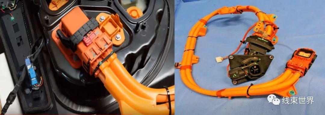 正是這2.5mm厚的銅板和這20片DEFCON端子,組成了端子世界中的最佳伴侶。正是這20片DEFCON端子的松散疊加和自由活動(dòng),把實(shí)際應(yīng)用中可能發(fā)生的偏移或者扭轉(zhuǎn)以及振動(dòng)所造成的影響降到了最低,確保了多達(dá)64個(gè)接觸點(diǎn)的最佳接觸性能,遠(yuǎn)遠(yuǎn)高于最多30個(gè)接觸點(diǎn)的同級(jí)別連接器。正是這獨(dú)具匠心的端子組合,接上50mm2的銅線,可以達(dá)到260A@85℃持續(xù)電流的載流能力,突破了Class4連接器200A@85℃左右的持續(xù)電流,跨越到Class5連接器的能力級(jí)別。正是這樣的端子組合,配上耐磨抗拉的塑料件,屏蔽效能高、接觸阻抗低的屏蔽環(huán),以及壓變特性好、拉伸強(qiáng)度高、耐高溫抗老化的硅膠密封圈,再加上設(shè)計(jì)精巧的CPA、HVIL、Lever等等附屬零件,造就了這款卓爾不群的高壓連接器HC Stak 25,源源不斷地支持著特斯拉最大功率239kW的驅(qū)動(dòng)電機(jī)強(qiáng)勁可靠的動(dòng)力輸出。老邁忍不住驚嘆于這小小連接器竟然可以如此創(chuàng)新,忍不住向那些平凡之中見偉大、細(xì)微之處見品質(zhì)的工程師們致以崇高的敬意!直流快充-動(dòng)力電池之高壓連接器—— HC Stak 35讓我們把目光轉(zhuǎn)向車輛后部的充電線束吧。沿著充電插座,我們可以看到兩條又長(zhǎng)又粗的橙色電纜一直延伸到動(dòng)力電池,這是外部電網(wǎng)給動(dòng)力電池充電的高壓線束和連接器。