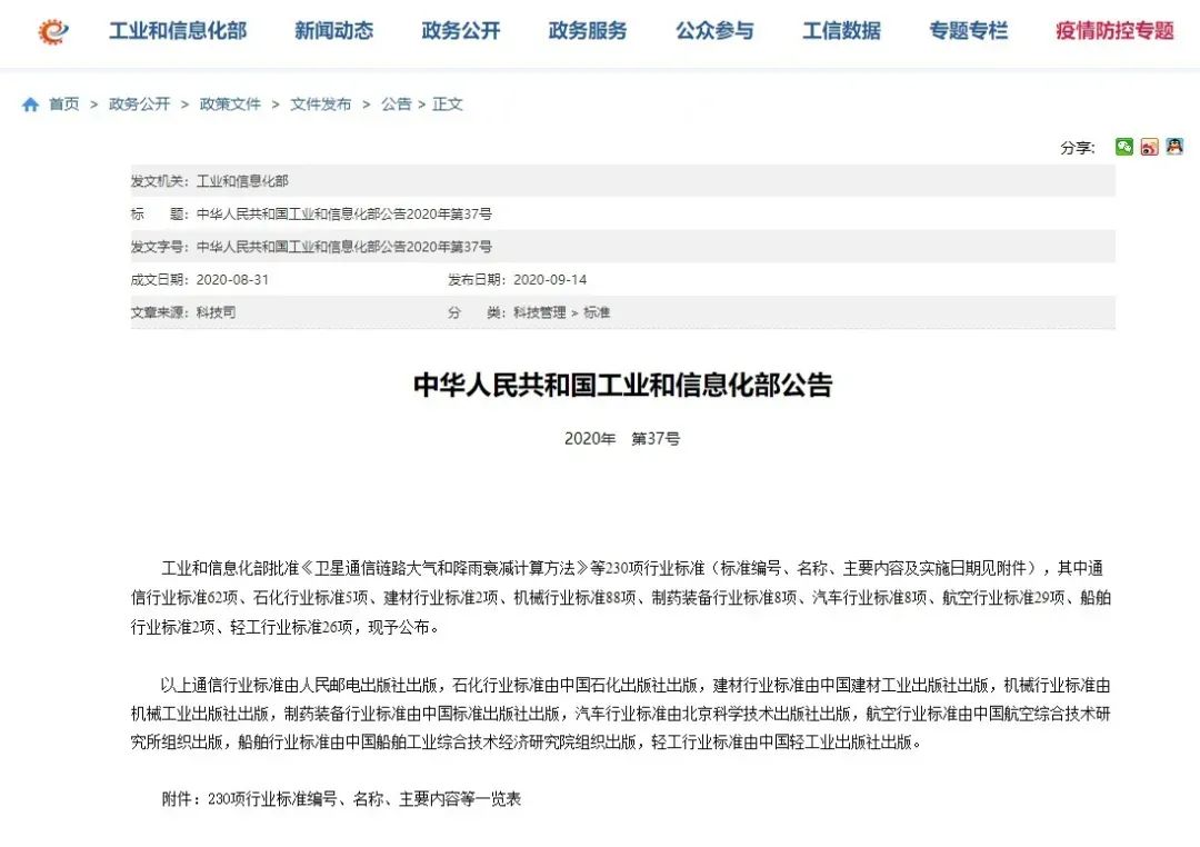 9月14日,工業(yè)和信息化部官網(wǎng)發(fā)布公告,工業(yè)和信息化部批準(zhǔn)《衛(wèi)星通信鏈路大氣和降雨衰減計算方法》等230項行業(yè)標(biāo)準(zhǔn)。