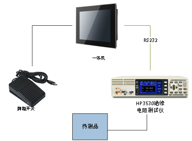 絕緣電阻測(cè)試系統(tǒng)由防爆一體機(jī)、HP3530絕緣電阻測(cè)試儀、待測(cè)絕緣電阻及腳踏開(kāi)關(guān)組成。