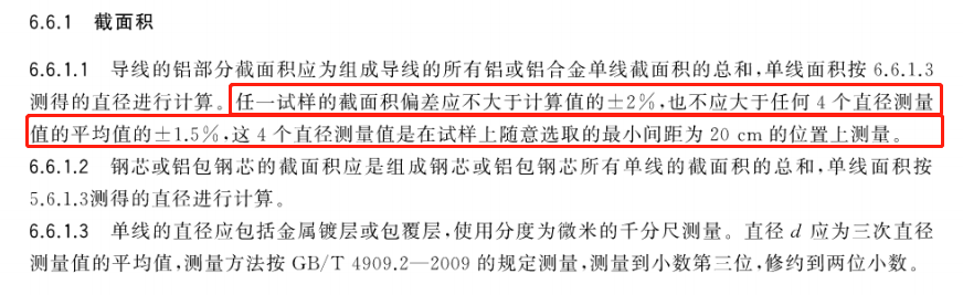 GB/T1179-2017《圓線同心絞架空導(dǎo)線》 6.6.1截面積中描述:“截面積的偏差應(yīng)不大于計(jì)算值的±2%,也不應(yīng)大于任何4個(gè)直徑測(cè)量值的平均值的±1.5%”,這句話如何理解呢?此處說的“計(jì)算值”是指附錄A 表A中“計(jì)算面積”嗎?截面積的偏差為何還要不大于直徑測(cè)量值的平均值的±1.5%?截面積和直徑不是一個(gè)單位如何比對(duì)呢?